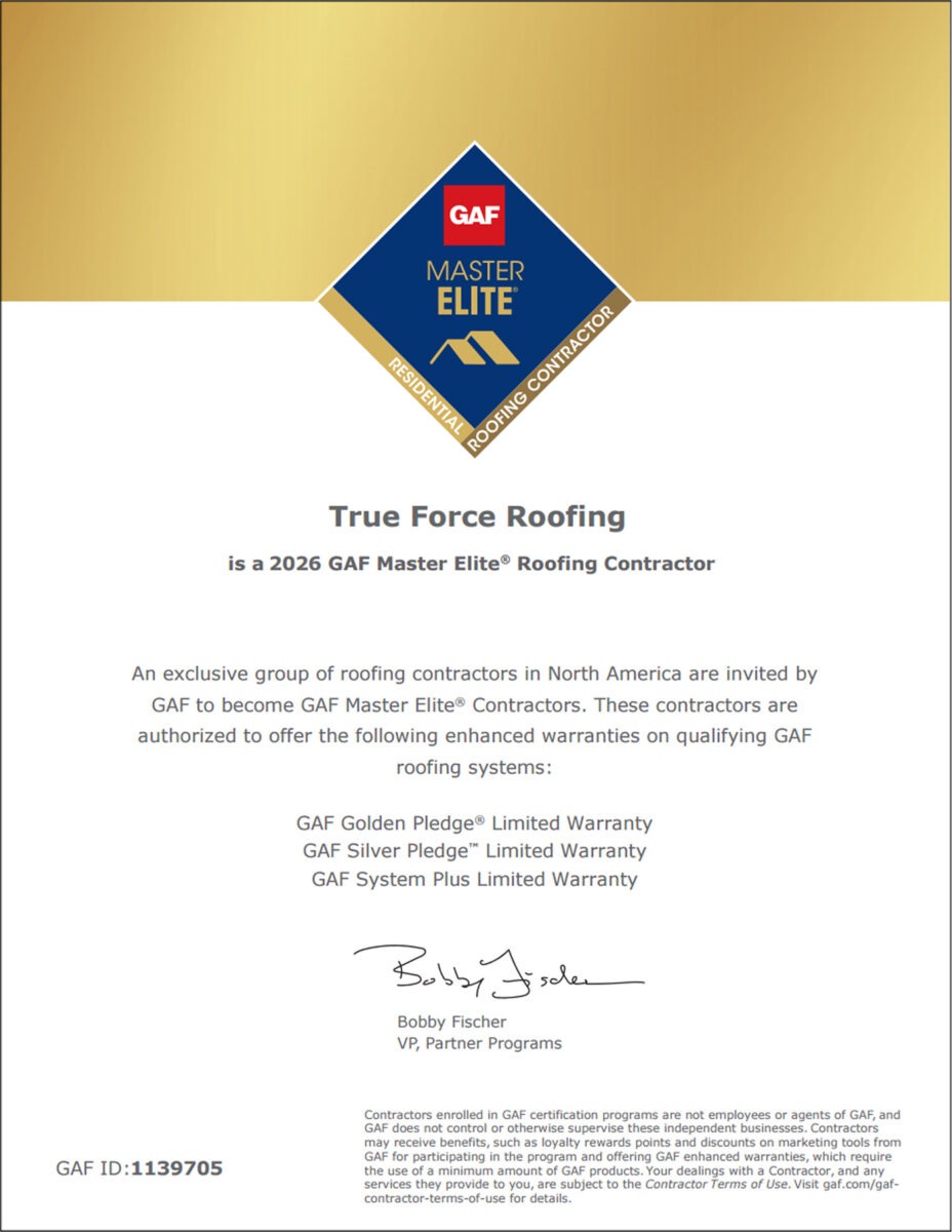 True Force Roofing stands among the highly select group of roofers in North America invited by GAF to become GAF Certified Master Elite Contractors. The certification requirements must be satisfied annually in order to remain in the program.